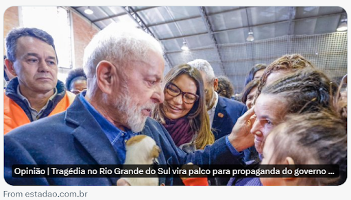 “Não existe, pelo que se vê no registro dos fatos, nenhum tipo de indecência que os governos Lula, ora em sua terceira encarnação, não sejam capazes de praticar. Já entregaram refugiados políticos para a ditadura de Cuba. Já pagaram mesadas para os deputados. Já roubaram mais que ninguém, no Brasil e no mundo. A ladroagem desesperada dos seus dois primeiros períodos à frente do País, mais o flagelo de Dilma Rousseff, entraram para a História universal como o maior episódio de corrupção serial que a humanidade já experimentou. Agora, com as enchentes no Rio Grande do Sul, Lula sobe mais uma barra. Diante da pior tragédia humana que o Brasil já viveu em sua história recente, só mostrou até agora uma preocupação: usar a desgraça para ver se consegue tirar proveito político pessoal.