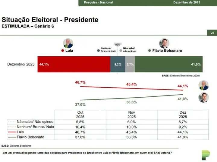 Levantamento realizado pelo Instituto Paraná Pesquisas em todo país entre os dias 18 e 22 de dezembro mostra que o presidente Luiz Inácio Lula da Silva lidera a corrida presidencial em todos os cenários de primeiro turno, mas viu cair a sua vantagem para o senador Flávio Bolsonaro (PL-RJ), hoje o seu concorrente mais provável na disputa pelo Palácio do Planalto. No último dia de Natal, o ex-presidente Jair Bolsonaro divulgou uma carta em que reafirmou que o seu candidato na disputa em 2026 será o seu filho primogênito.